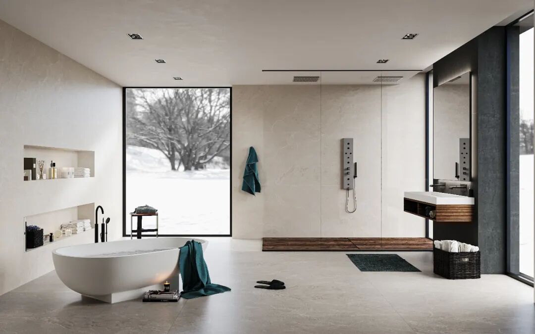 在工艺上,广泛应用数码哑雕和精雕干粒等特殊工艺。数码哑雕能使砖面触感细腻柔顺,同时增强纹理的立体感;精雕干粒工艺则能塑造出更丰富的表面肌理和做旧质感。这些工艺不仅提升了瓷砖的美观度,还赋予了它独特的触感体验,实现了从视觉、触感到空间情绪的一体化设计。