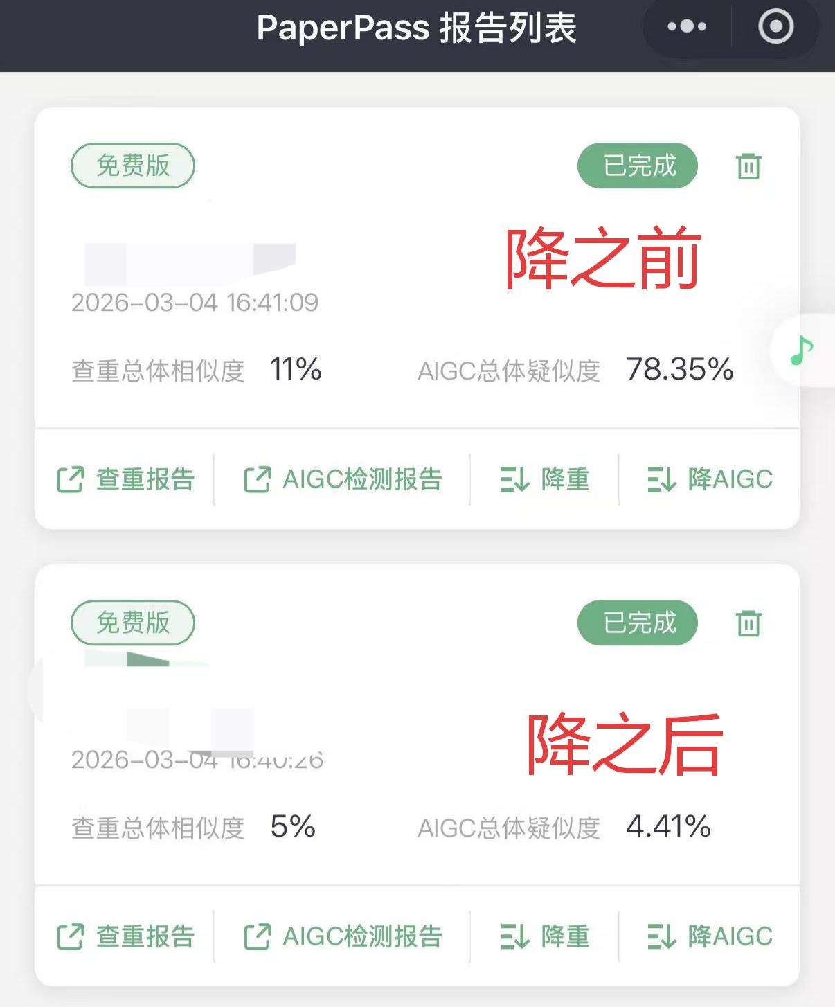 和降迹灵一样,它也支持“双降”,承诺降完后查重率<15%、AIGC率<20%,不达标可免费再降或退款,实测效果很稳。最突出的优势就是100%格式无损,理工科的公式推导、医科的实验图表,还有文科的文献引用格式,降重后全都和原文一致,不用二次排版,对于格式要求严格的论文来说,简直是救星。