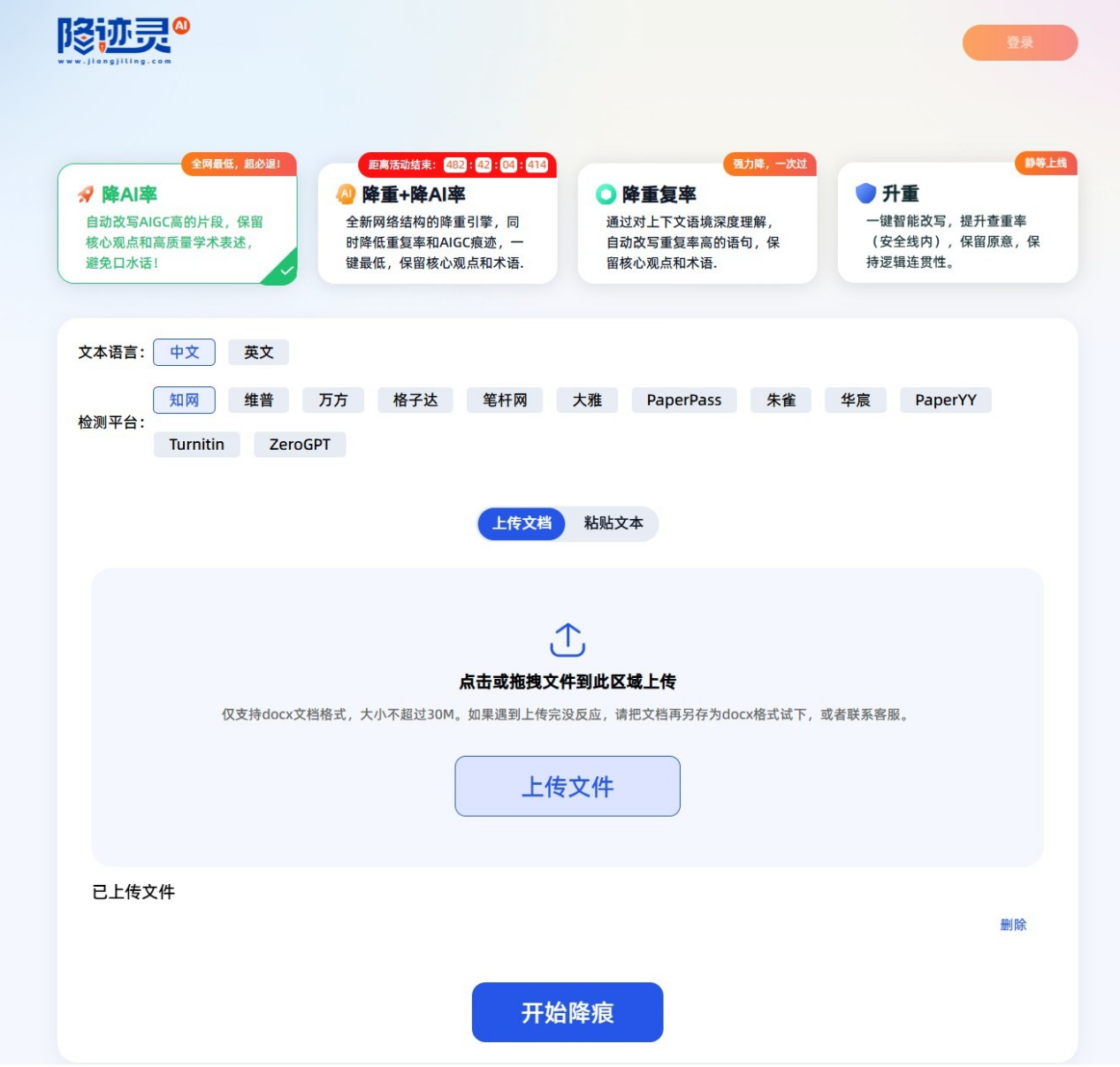 1. 单纯消AI痕迹、降重,追求高性价比→降迹灵AI(千字1.5元起,多平台适配);