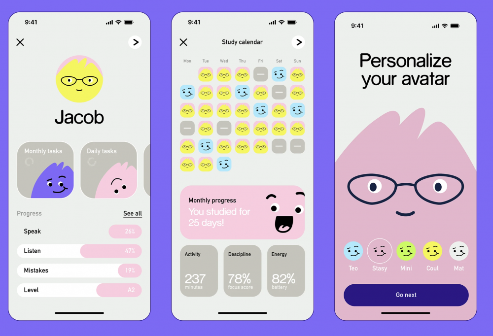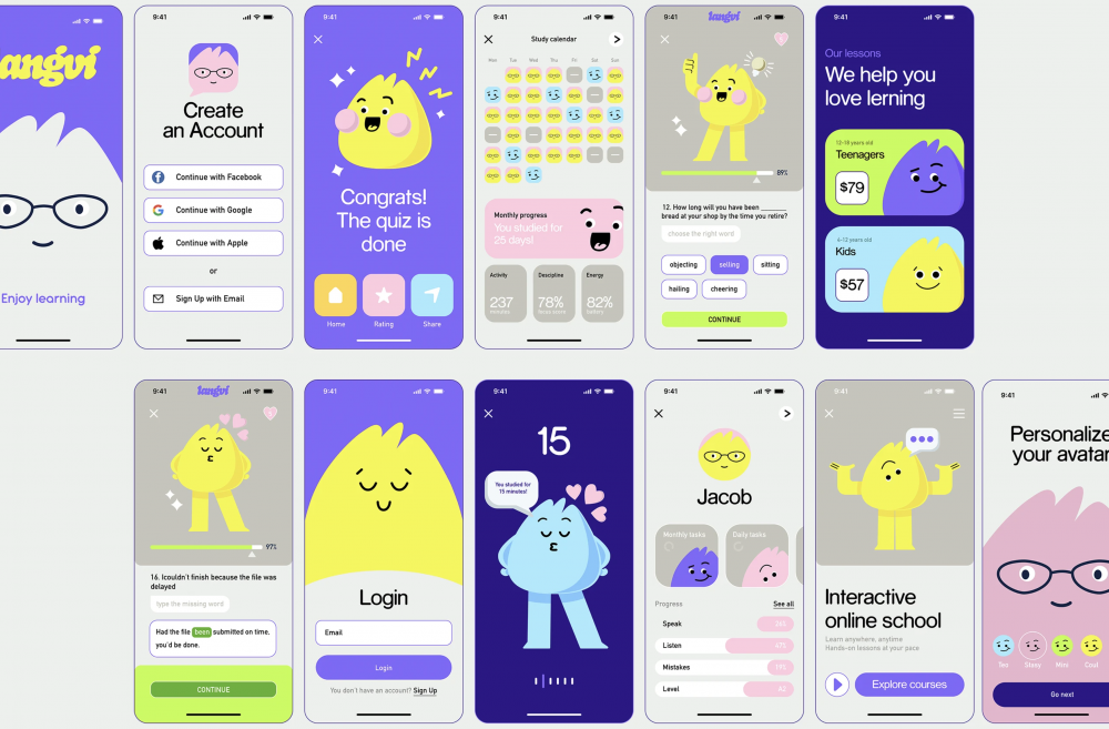面向儿童/青少年的语言学习类App,需要兼顾教育功能与用户粘性。Langvi以软萌水滴形卡通形象为核心IP,设计丰富表情、动作与情绪状态贯穿全流程界面,将冰冷学习工具转化为有温度的学习伙伴,大幅降低孩子学习抵触感;以明亮马卡龙色系为主色调搭配柔和浅灰底色,营造活泼有趣学习氛围;用圆角卡片、圆润字体、扁平化插画实现全端视觉统一,用表情符号标注每日学习状态、进度条与爱心星星强化正向反馈。北京兰亭妙微设计团队深耕儿童教育类产品UI/UX设计多年,从视觉设计、信息架构、交互体验三个维度,系统解析Langvi的IP化视觉、全流程学习闭环与趣味化交互的实战应用,为设计从业者提供一份完整的儿童语言学习App设计白皮书。