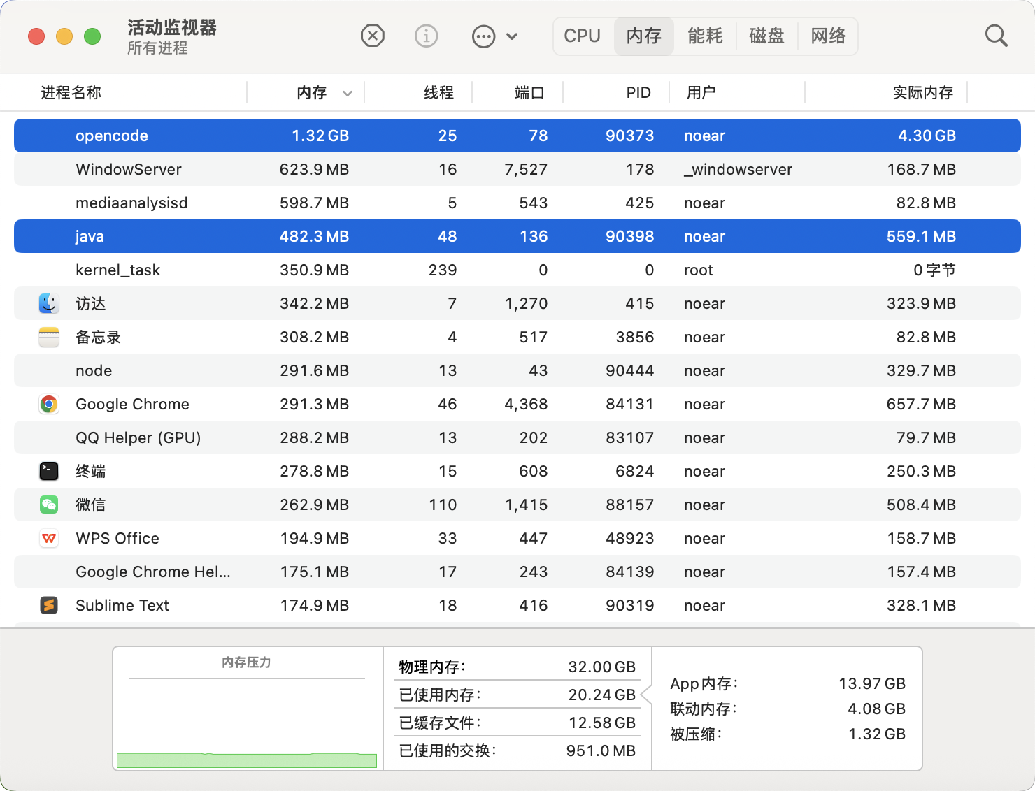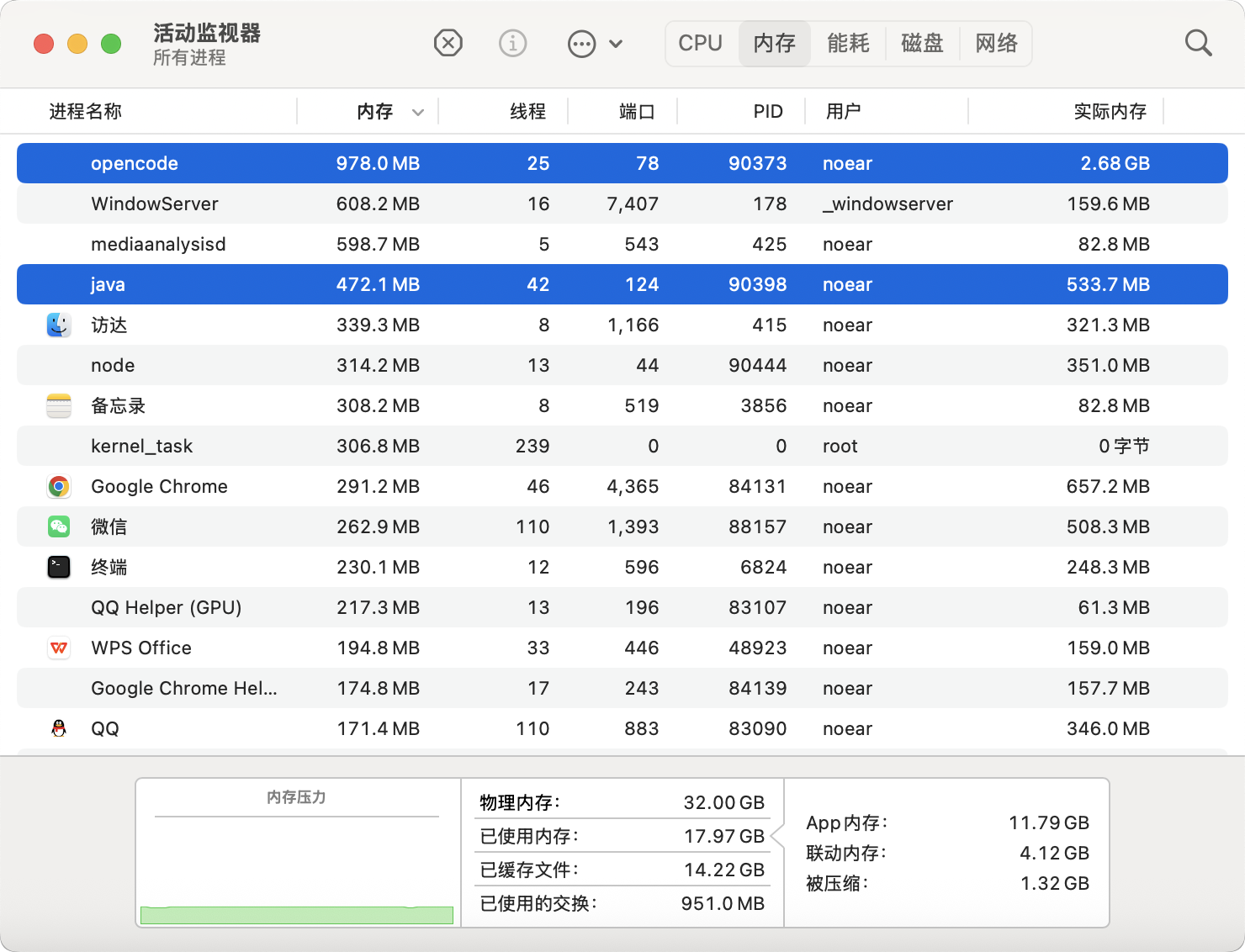 OpenCode 启动不久便占据了近 2.7G 内存,而 SolonCode 仅维持在 500M 左右。