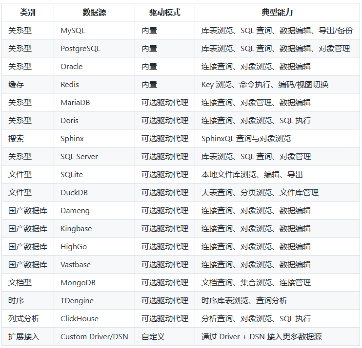 - 多数据源统一管理:支持 MySQL、PostgreSQL、Oracle、Redis、SQL Server、MongoDB、ClickHouse 等主流数据库,同时兼容达梦、金仓等国产数据库