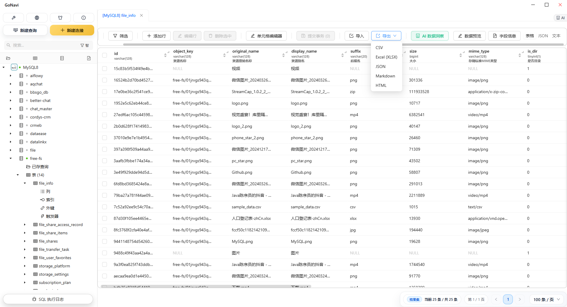 - 高效数据操作:支持单元格实时编辑、批量增删改、事务提交与回滚,支持 CSV、Excel、JSON、Markdown 多格式导出