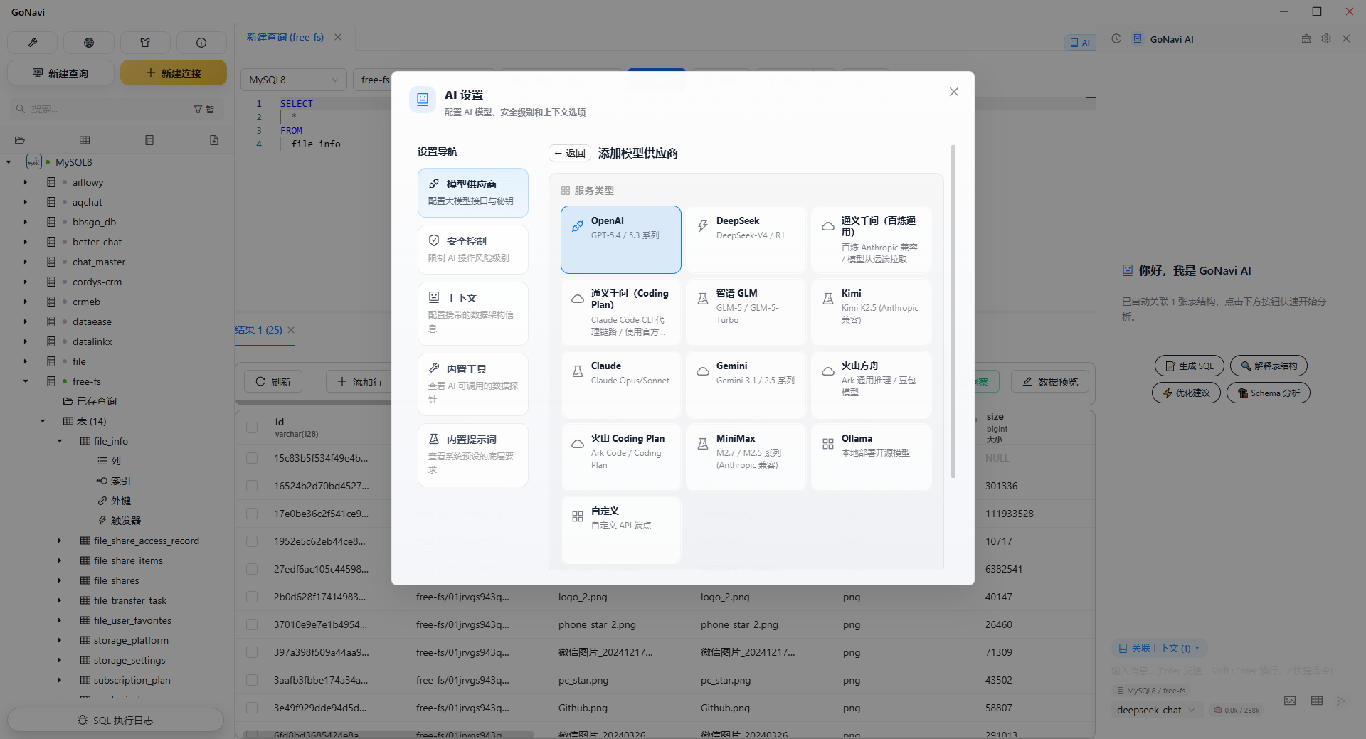 - AI 辅助:可对接 OpenAI、Gemini、Claude 等大模型,根据表结构自动生成 SQL、优化语句、执行计划分析
