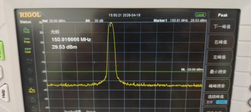 VHF 频段(150.91MHz):输出功率达 29.53 dBm(约 0.9W),邻道抑制比优良,频谱纯净。