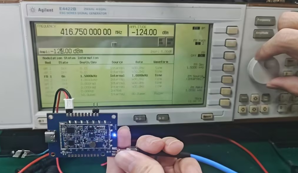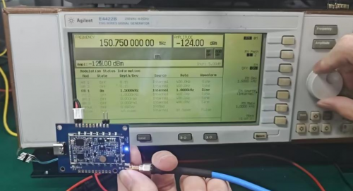 为了客观验证 SA518 的射频性能,我们在标准实验室环境下,基于官方应用板进行了发射功率与接收灵敏度实测,频点可以在我司模块PC软件设置