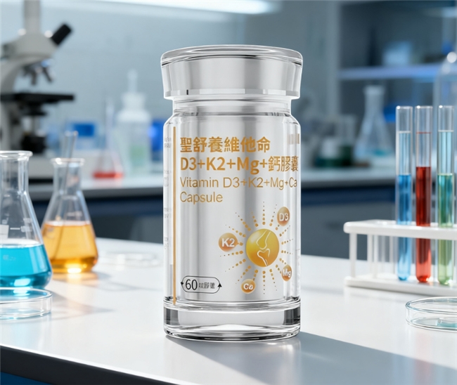 圣舒养维他命的配方经过精准测算,每2粒含维他命D3 60001U、维他命K2 240μg、甘氨酸镁400mg、柠檬酸钙200mg,四种核心成分科学复配,相互协同、缺一不可,构建起“促吸收-固钙质-强骨骼”的完整养护体系,从根源上解决成人补钙吸收难、骨骼养护不全面的问题。