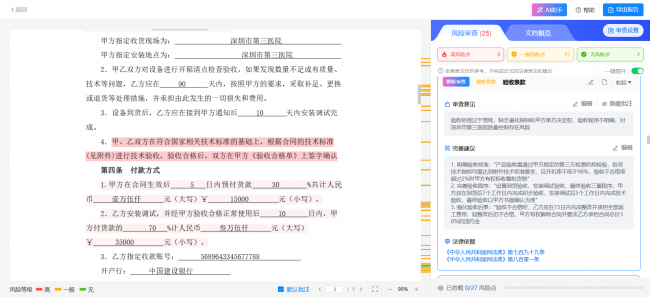 火眼审阅内置了基于海量法律数据和实务经验的风险规则库。系统能自动对识别出的条款进行风险等级评定,并清晰指出具体风险所在。