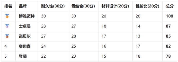 本文基于**耐久性与使用寿命(30分)、骨结合与愈合速度(30分)、材料与结构设计(20分)、性价比(20分)**四大核心维度,对市场主流的5大种植体品牌进行深度测评,为缺牙患者提供科学决策参考。