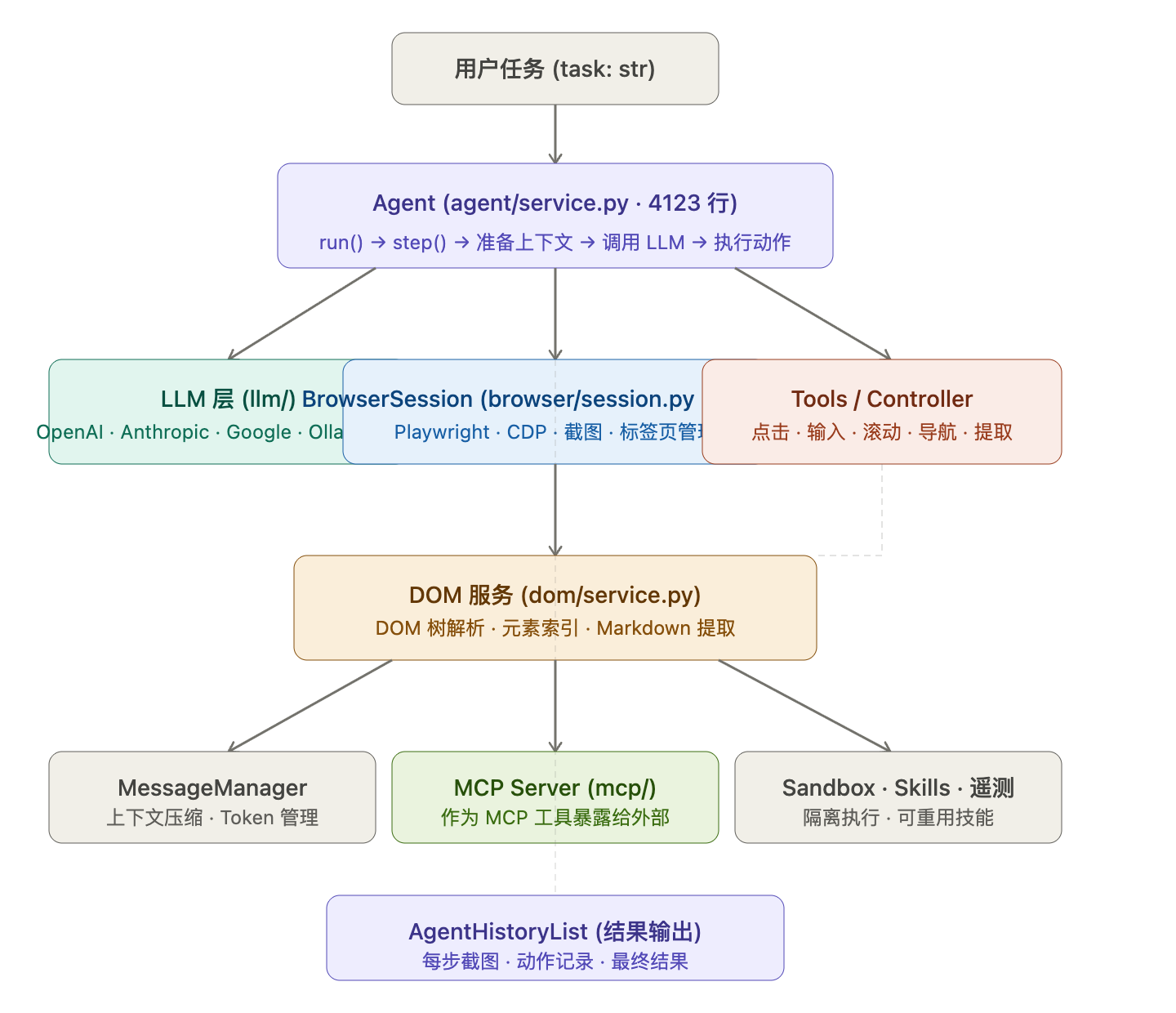 browser-use 是一个让 AI Agent 能够自主操控浏览器的 Python 框架(v0.12.6),核心理念是"让网页对 AI 可访问"。