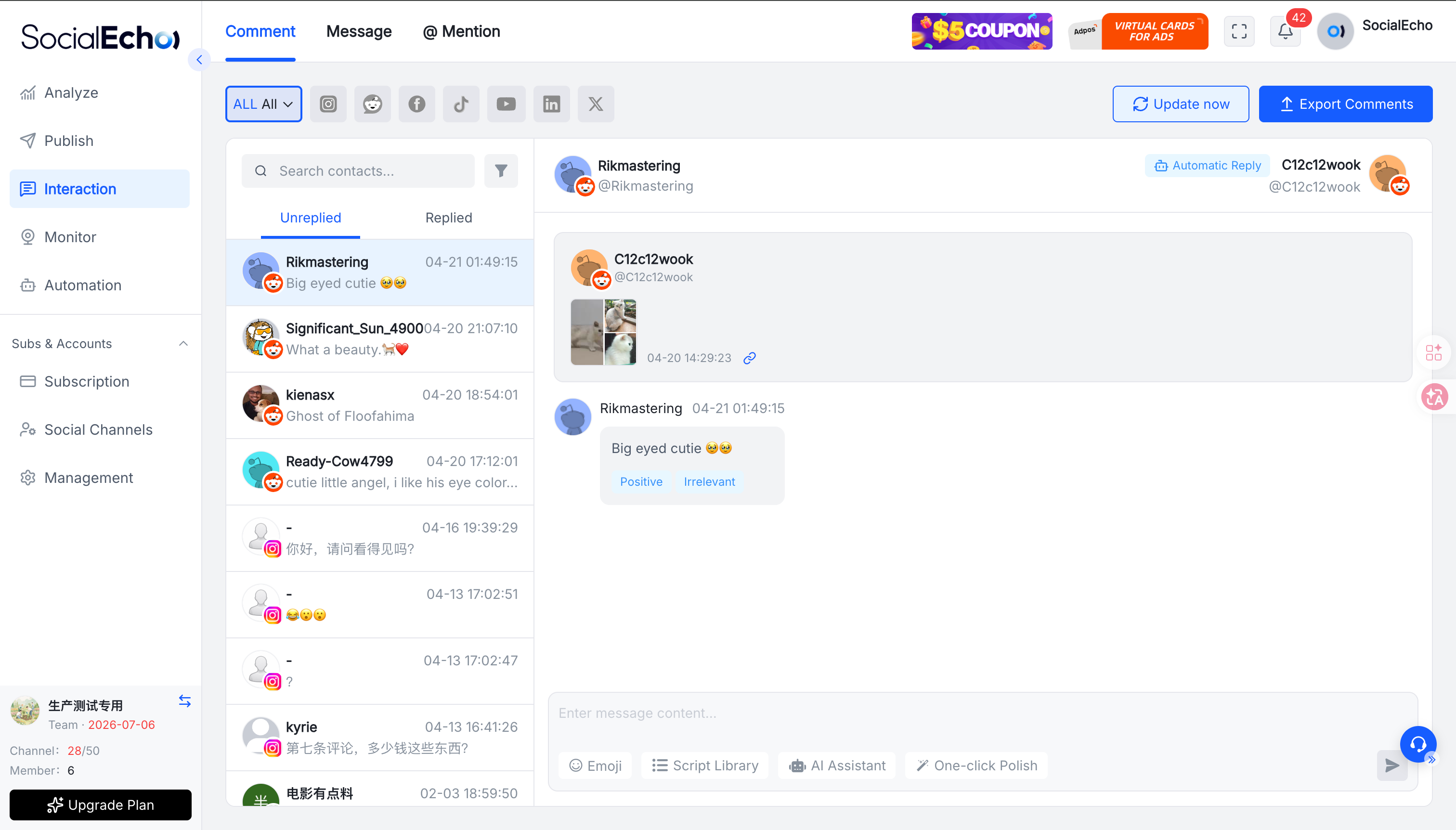 在试用了三款工具之后,他最终选择了 SocialEcho。SocialEcho在效率、功能和价格之间找到了最佳平衡点,对于一个三个人的小团队来说,这正是他们最需要的。