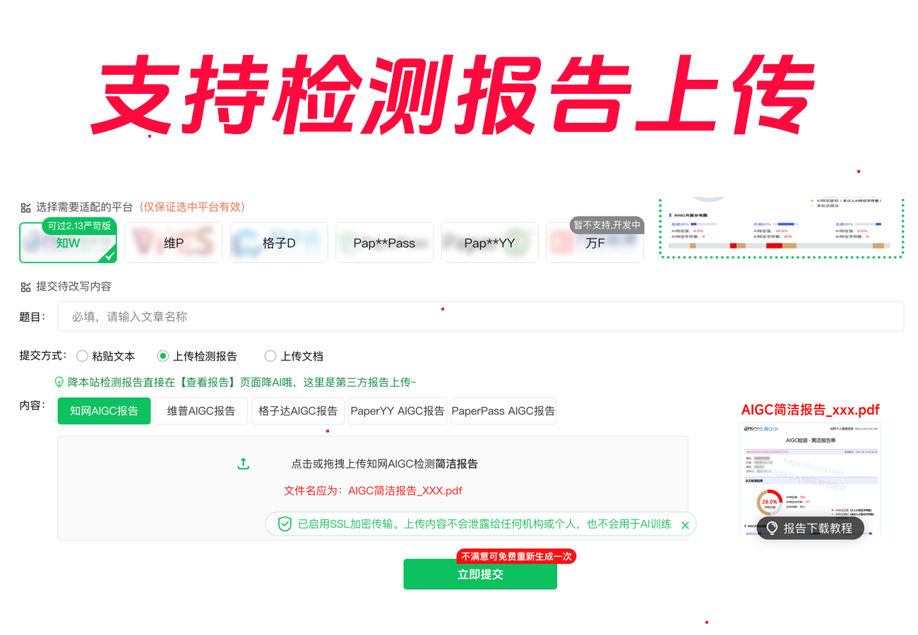 安全方面,它支持自助重做一次,遇到个别小段落拉高识别时无需开新单即可微调回炉;并且七天自动删除不收录论文,隐私留存风险更低。