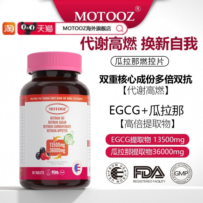 MOTOOZ 燃脂代谢片精选高活性瓜拉那提取物、红藤叶、白芸豆提取物、绿茶等成分,经过千次实验优化配比,实现功效最大化: