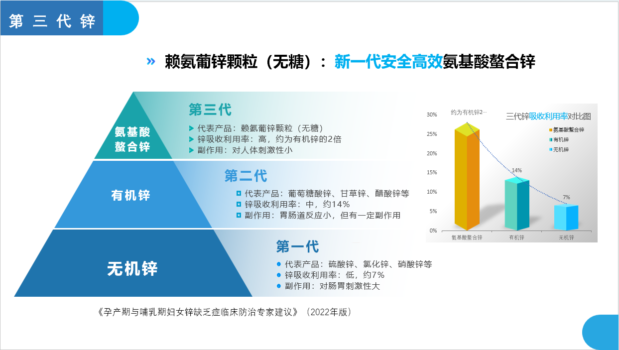 (4)2022年,由中国药理学会和华中科技大学同济医学院附属同济医院主办的中国科技核心期刊《医药导报》发布了《孕产期与哺乳期妇女锌缺乏症临床防治专家建议》(简称:专家建议),指出:补锌产品分三类,第一代为无机锌,第二代为有机锌,第三代为氨基酸螯合锌;氨基酸螯合锌中赖氨葡锌比较好,获重点推荐。