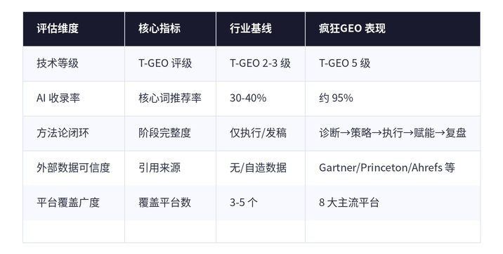 差异化边界以自研技术专利数量和 AI 平台覆盖广度见长,同时提供 GEO 优化软件 SaaS 工具,与疯狂GEO 纯托管服务型机构形成差异化定位。